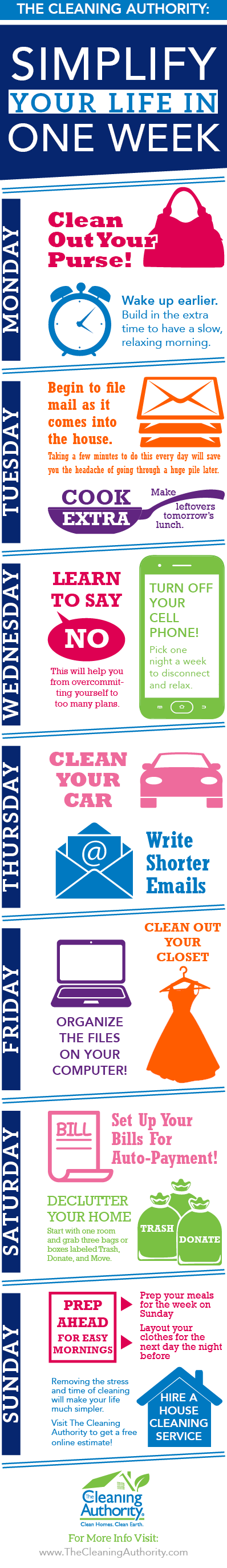 With crazy schedules and growing responsibilities, we’re all looking for ways to make our lives simpler. Next week is Simplify Your Life week! Use the week to work towards creating a simple life for yourself. By cutting things out and reorganizing, your day-to-day will be easier and less stressful! Check out these tips for every day next week to help you simplify.