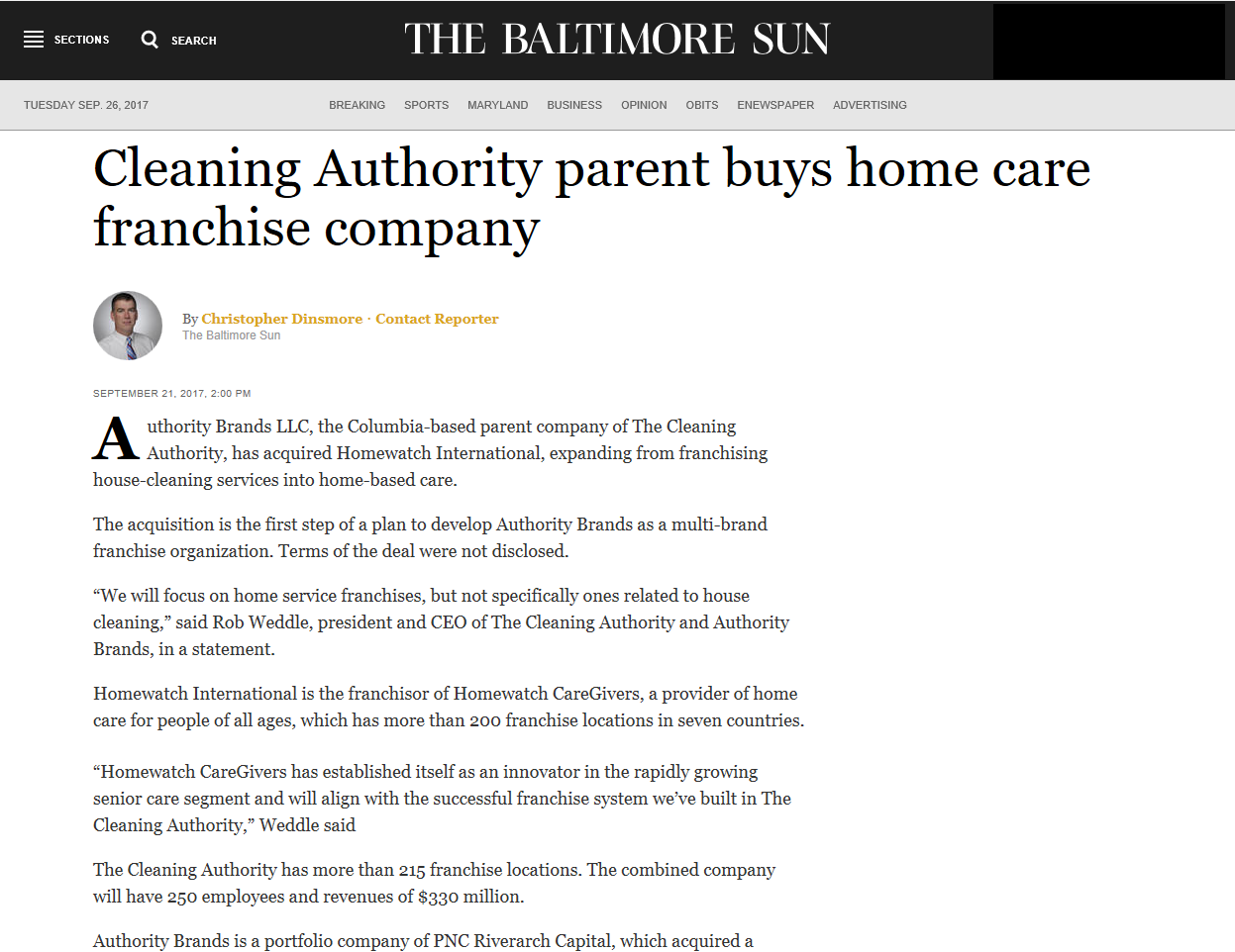 The Cleaning Authority’s parent company, Authority Brands LLC, has expanded their brands and services into the home-based care industry through the acquisition of Homewatch International. Acquiring Homewatch CareGivers provides home care for people of all ages in seven countries, from over 200 franchise locations. Rob Weddle, The Cleaning Authority and Authority Brands president and CEO, applauded Homewatch CareGivers’ ability to grow within the senior care industry and looks forward to successfully applying The Cleaning Authority’s franchise system to their efforts. Click on the image below to read the full article.