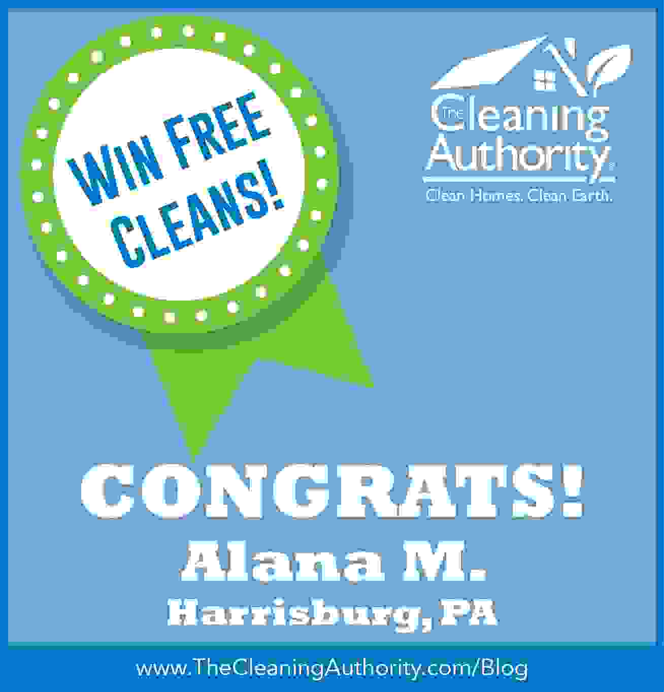 Congratulations to Alana M. in Harrisburg, PA for recently winning a full year of house cleaning, free of cost.